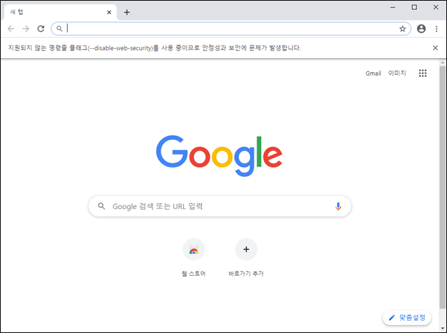 '지원되지 않는 명령줄 플래그(--disable-web-security)를 사용 중이므로 안전성과 보안에 문제가 발생합니다'라고 하는 안내문구가 보이시죠? 바로 저 안내문구가 CORS 오류를 체크하지 않는 다는 것을 의미합니다. 물론 이 뿐만 아니라 사용자를 보호하기 위한 다른 보안 기능들도 꺼져있다고 보시면 됩니다. 개발 시에 사용하는 임시방편이라는 의미죠. 하지만 다른 CORS 툴을 깔거나 고생하는 것보다는 훨씬 편리한 방법입니다.